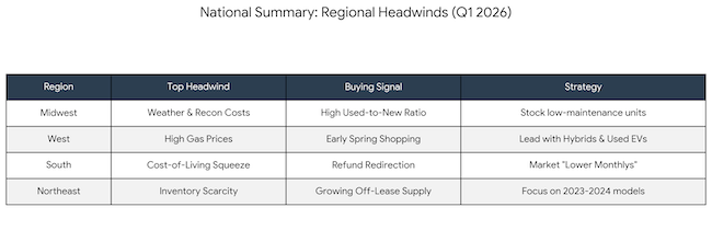 Wholesale Value Surge: The Manheim Used Vehicle Value Index (MUVVI) hit 212.3 in February, its highest level since 2023, signaling that acquisition costs are rising as the spring season heats up.