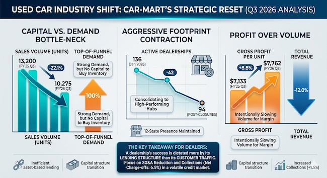 • Aggressive Footprint Contraction: The closure of 42 dealerships (one-third of its network) following 18 previous consolidations signals a pivot from broad geographic reach to "high-performing hubs." The company is moving away from an "inefficient" asset-based lending model in favor of a leaner, centralized operation that can better absorb market volatility.