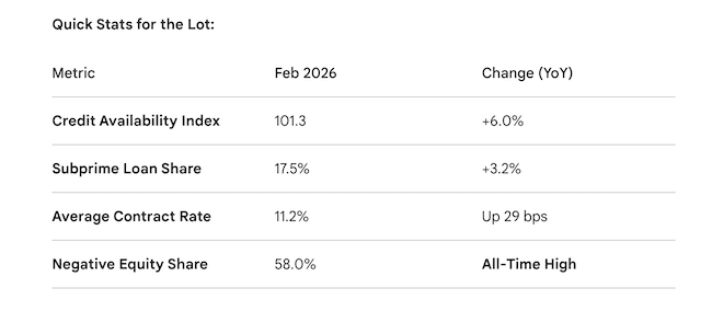 The headline of the month is the aggressive return of subprime auto lending. The share of loans going to subprime borrowers jumped to 17.5% in February, significantly higher than seasonal norms. For independent used car dealers, this means lenders are showing a renewed appetite for higher-risk paper, making it easier to get "stuck" deals bought.